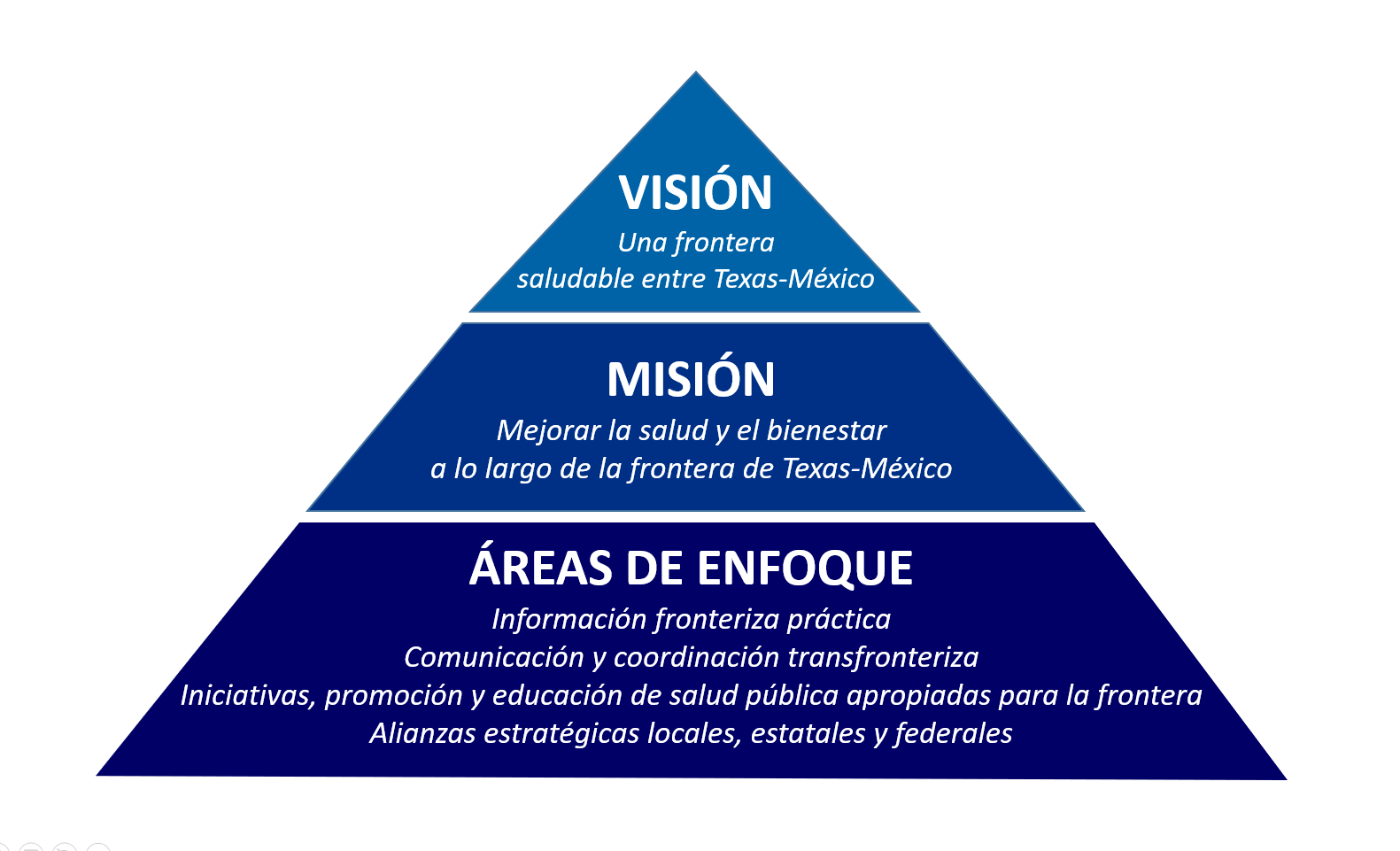 Operamos asumiendo que los problemas de salud pública no pueden ser contenidos dentro de los límites internacionales y que la región fronteriza México-Estados Unidos es una sola zona epidemiológica. Trabajamos juntos para mantener a Texas sano al mantener a nuestra frontera sana.