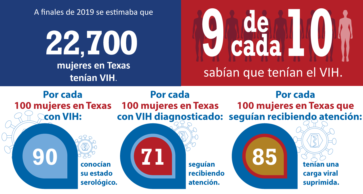 A finales de 2019 se estimaba que 22,700 mujeres en Texas tenían VIH. 9 de cada 10 sabían que tenían VIH. |