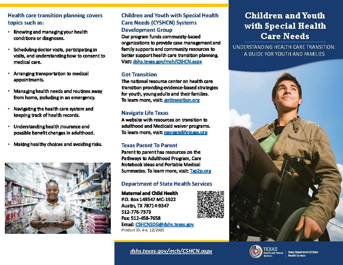 Salud Materna e Infantil del DSHS publica folletos para ayudar a las familias y a los proveedores a entender la importancia de planear la transición de un niño a la edad adulta.