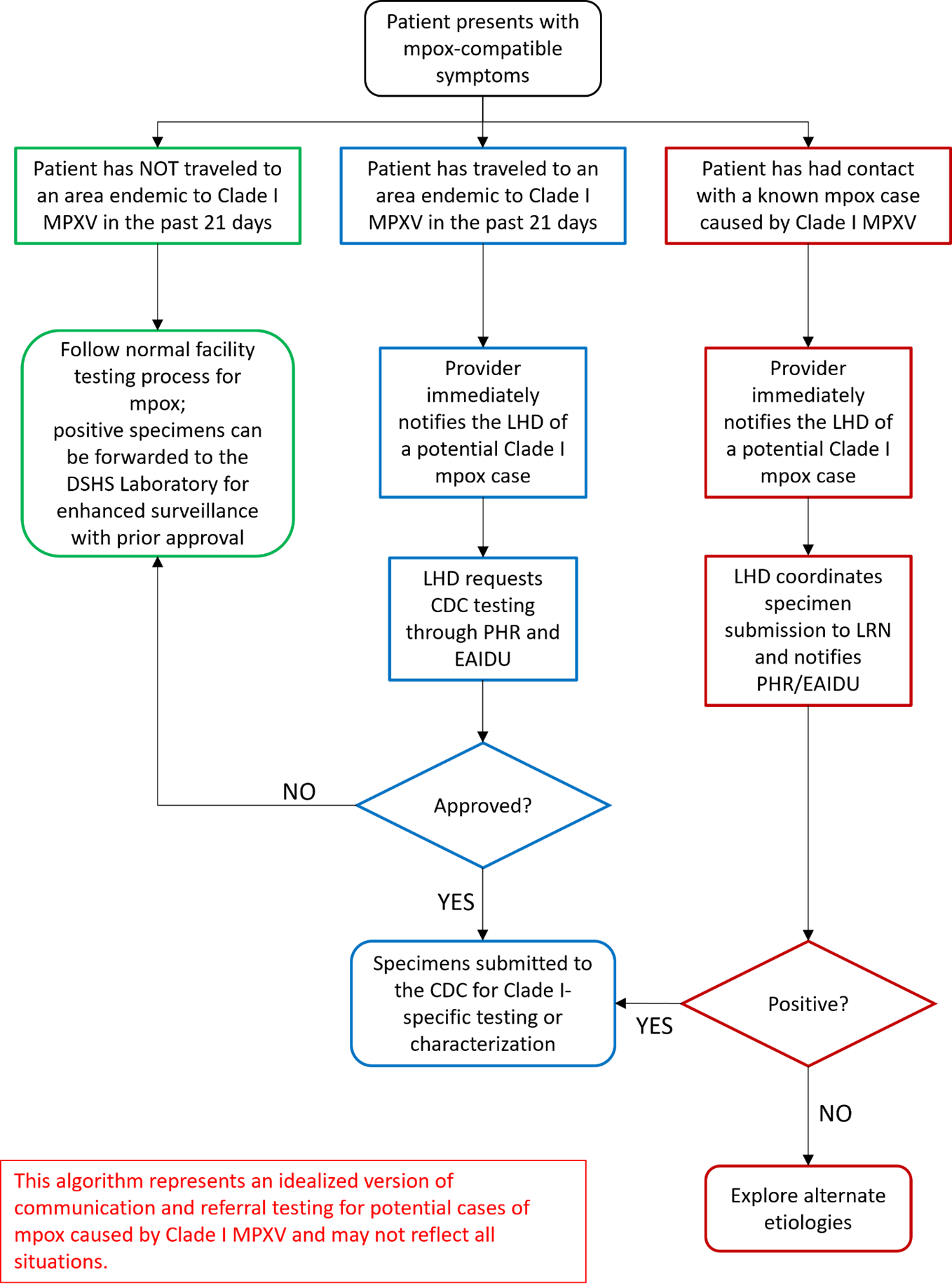 For patients with a travel history to an area where Clade I MPXV is endemic (e.g., the Democratic Republic of Congo, Central African Republic, Republic of the Congo, Cameroon, Gabon, and Equatorial Guinea) within 21 days of illness onset, Clade I MPXV testing should be conducted. Clinicians should immediately notify their local health department. The local health department will coordinate testing approval with the Public Health Region and DSHS. Ideally, specimens will be submitted directly from the provider for testing upon approval from DSHS and the CDC.