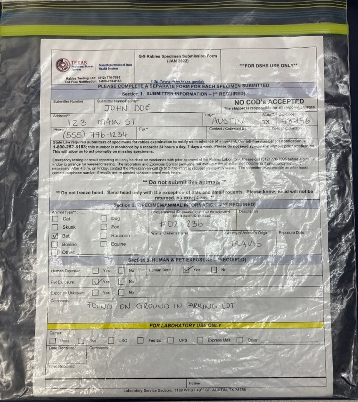 A tutorial on packing and submitting rabies specimens is available for download at Microbiology Specimen Submission Job Aids | Texas DSHS.