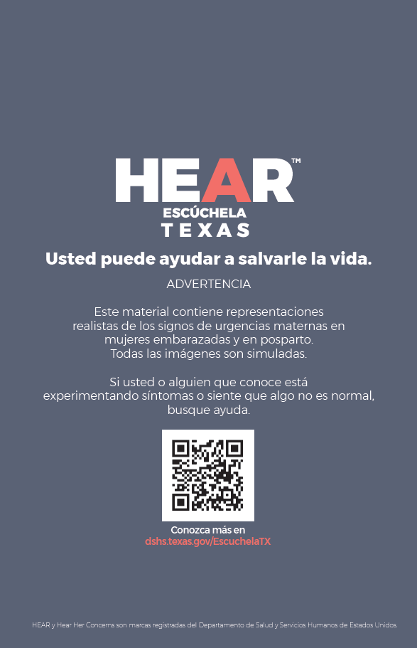 HEAR, Hear Her Concerns, and Escúchela are registered trademarks of the U.S. Department of Health and Human Services. Use of these marks by the Texas Department of State Health Services does not imply endorsement by HHS/CDC.