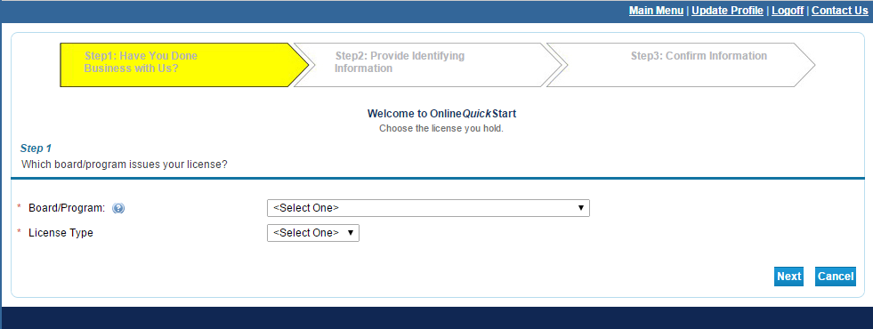 The next screen will prompt you with a question, asking if you are a license holder for the license type you are attempting to add. Please read all instructions on the screen and select "Next."