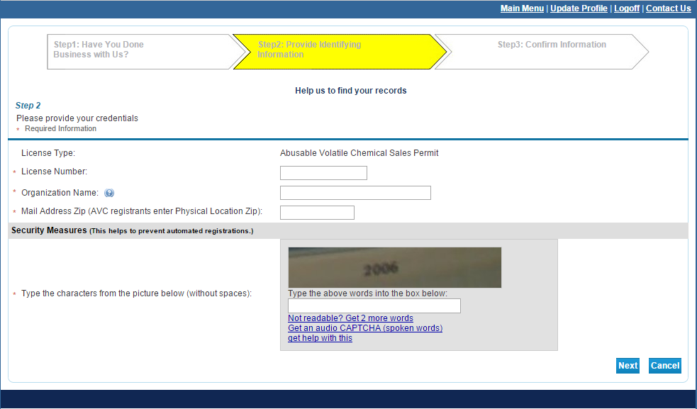 On the following screen, add the license number, and add any other fields requested. Complete the CAPTCHA and select "Next."