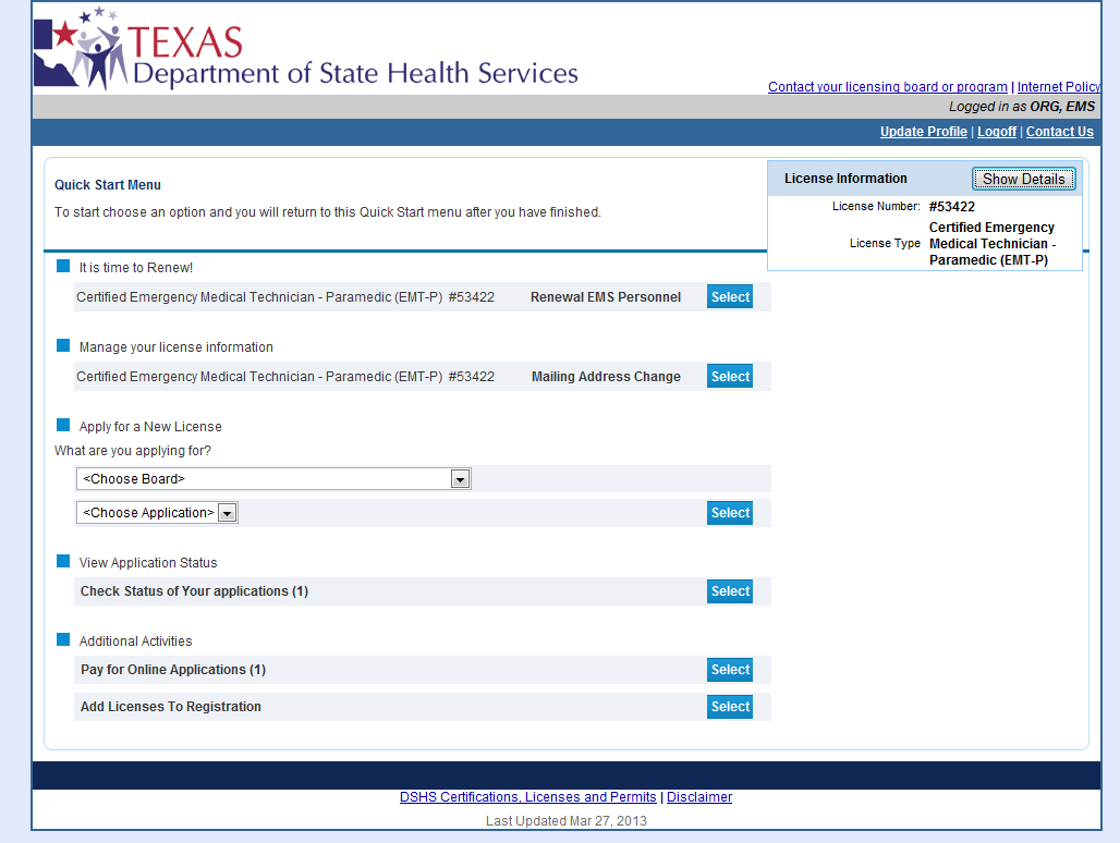 From the next screen, please select the licensing board and license type that you wish to add to the account. Please see Find Your Licensing Board or Program - Online Licensing Help Center | Texas DSHS page for more information on locating your licensing board or program.