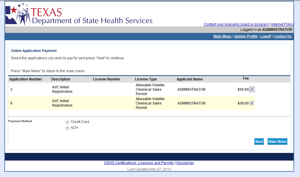 This screen shows that we have initial applications that are due to be paid if we want to complete the applications. At this point, you may choose which transaction you want to pay for by checking/unchecking the boxes next to the Fee on the right side. Then, select method of Payment; here it can be a credit card or electronic check (ACH) payment. Then click Next.