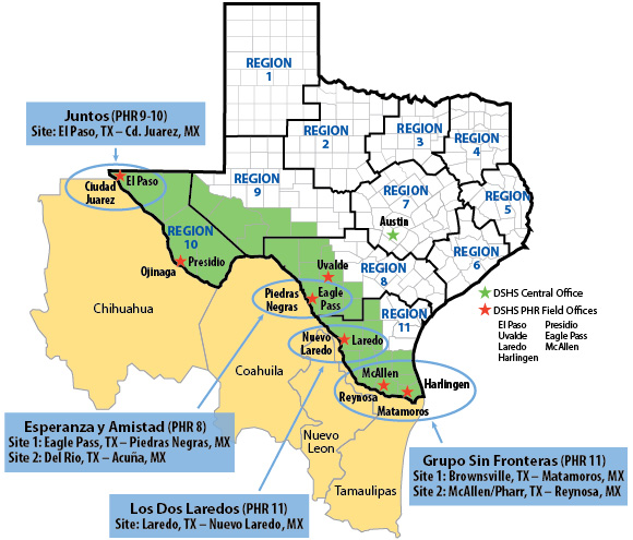 The DSHS Binational Tuberculosis (TB) Program in the TB and Hansen’s Disease Branch provides TB prevention and care services addressing the high incidence of TB cases along the Texas-Mexico border to reduce transmission of TB and to protect public health in Texas. Texas has 1,254 miles of border that stretches from the Gulf to El Paso. There are four binational program sites serving the Texas-Mexico border (listed below). The Binational Programs are directed by the guiding principles, mission, and values of DSHS and the Secretariat of Health. The standards are set forth by the DSHS TB and Hansen's Disease Branch.